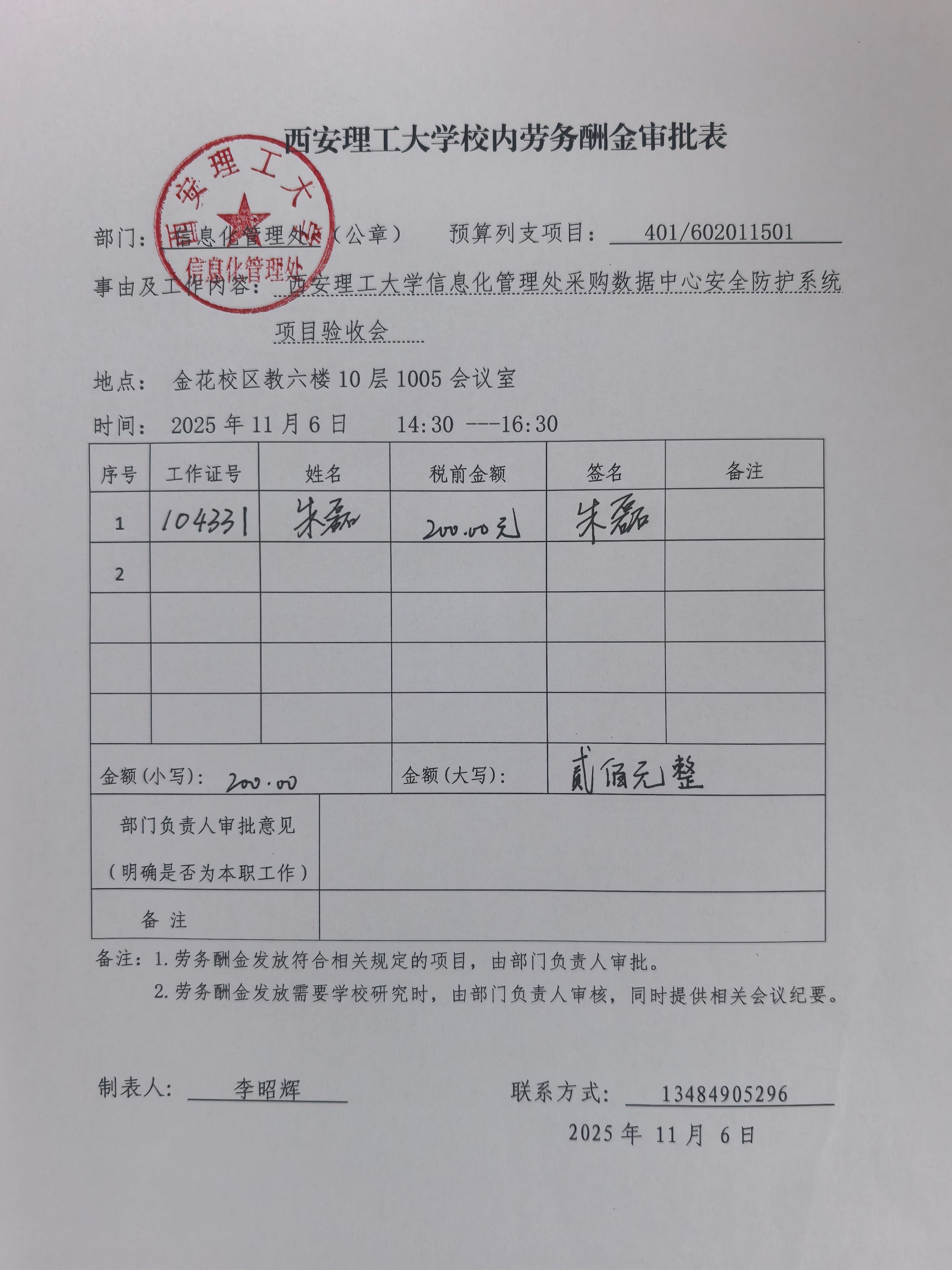 2025年11月6日下午14:30-16:00,在金花校区教六楼10层1005会议室,召开“bv伟德源自英国始于1946采购数据中心安全防护系统项目验收会”,相关单位工作人员及校内外专家参加会议;参会的校内专家应支付劳务费,明细见下表,特此公示: